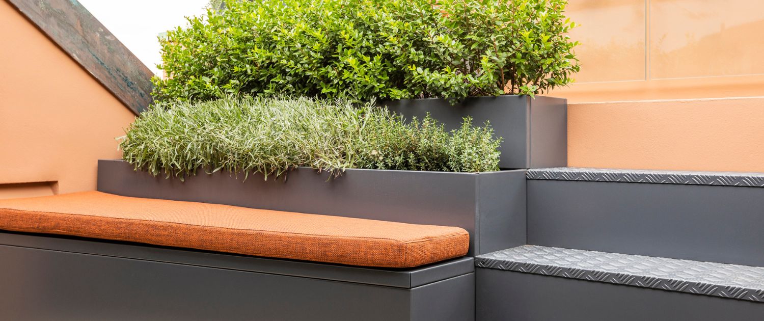 Scalare is a two-level modular planter, based on the interpretation of the Cube planter, suitable for large outdoor spaces, with a simple and aesthetic design, with greenery divided into two levels and a metal finish, with the option of installing a strip-led wall as in the Cube Led.