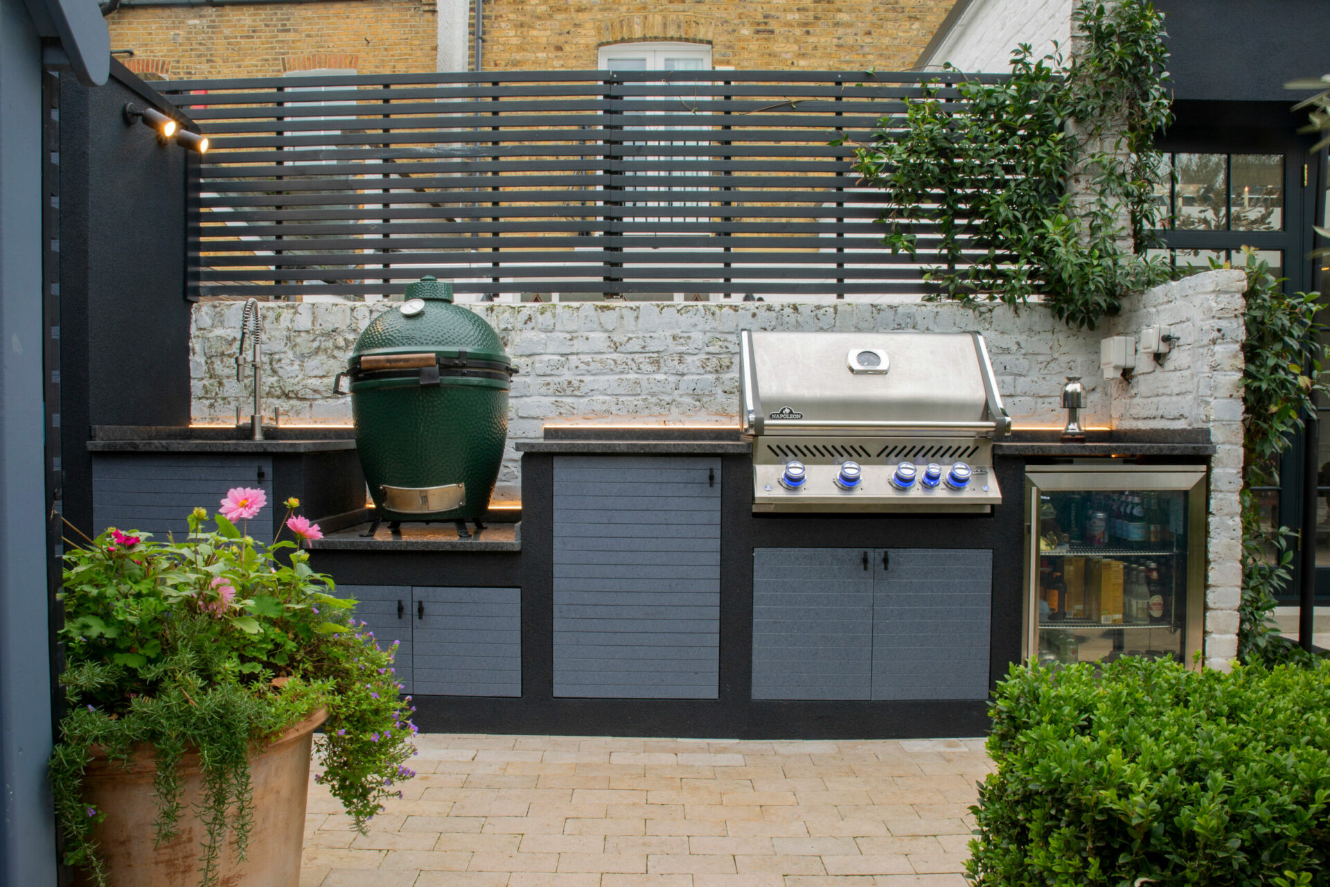 Your outdoor kitchen cabinetry (both the carcasses and the doors) need to be 100% waterproof, for obvious reasons. UV resistance is another factor to consider when selecting door finishes and furniture too, as they will also face direct sunlight for many weeks throughout the year and so can be susceptible to fade over time. Stainless steel is a great option for a sleek look as well as being easy to maintain. A further consideration should be made regarding heat treated areas. Barbeques typically generate up to 5 times more heat than their interior counterparts, so it is vitally important to ensure certain areas are heat treated or shielded. A good option is to get some fitted coverings that will protect all of these elements. If the right choices are made in the beginning of your outdoor kitchen design journey, you will be delighted with the results for years to come.